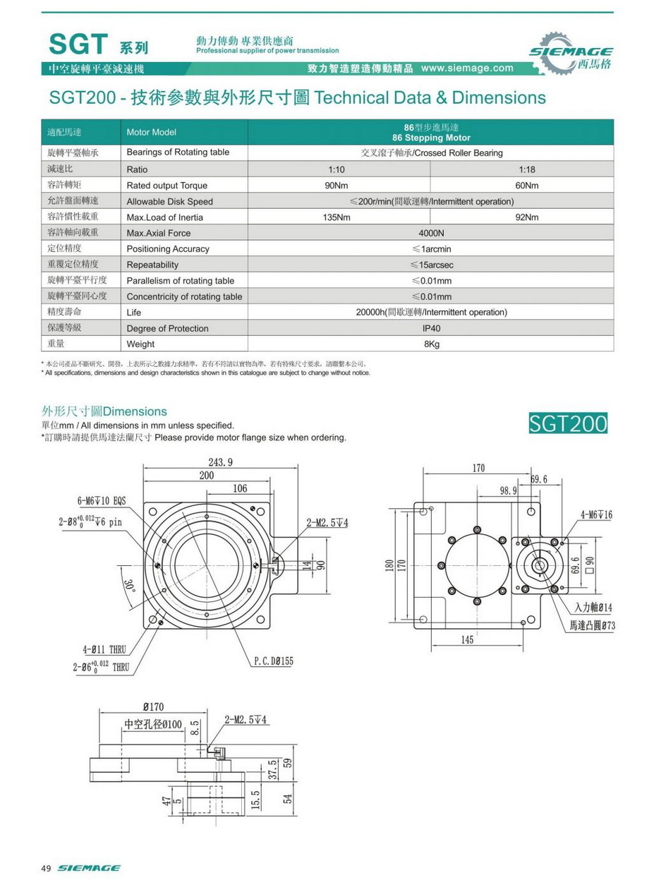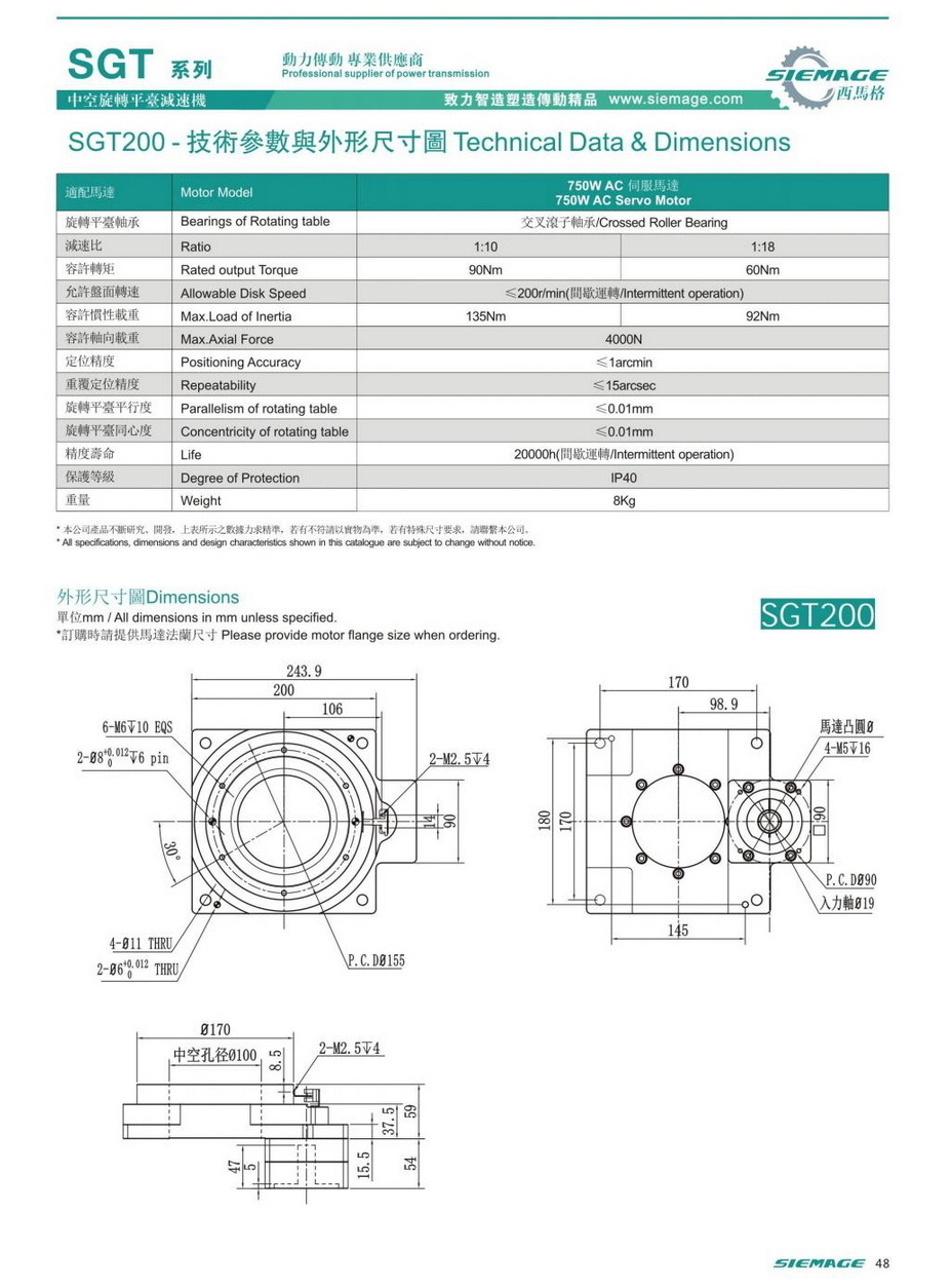 中空旋转平台减速机SGT200,siemage中空平台可配各品牌750W伺服电机,伺服马达,各厂家86型步进马达,86步进电机。减速比有1:10,1:18等。